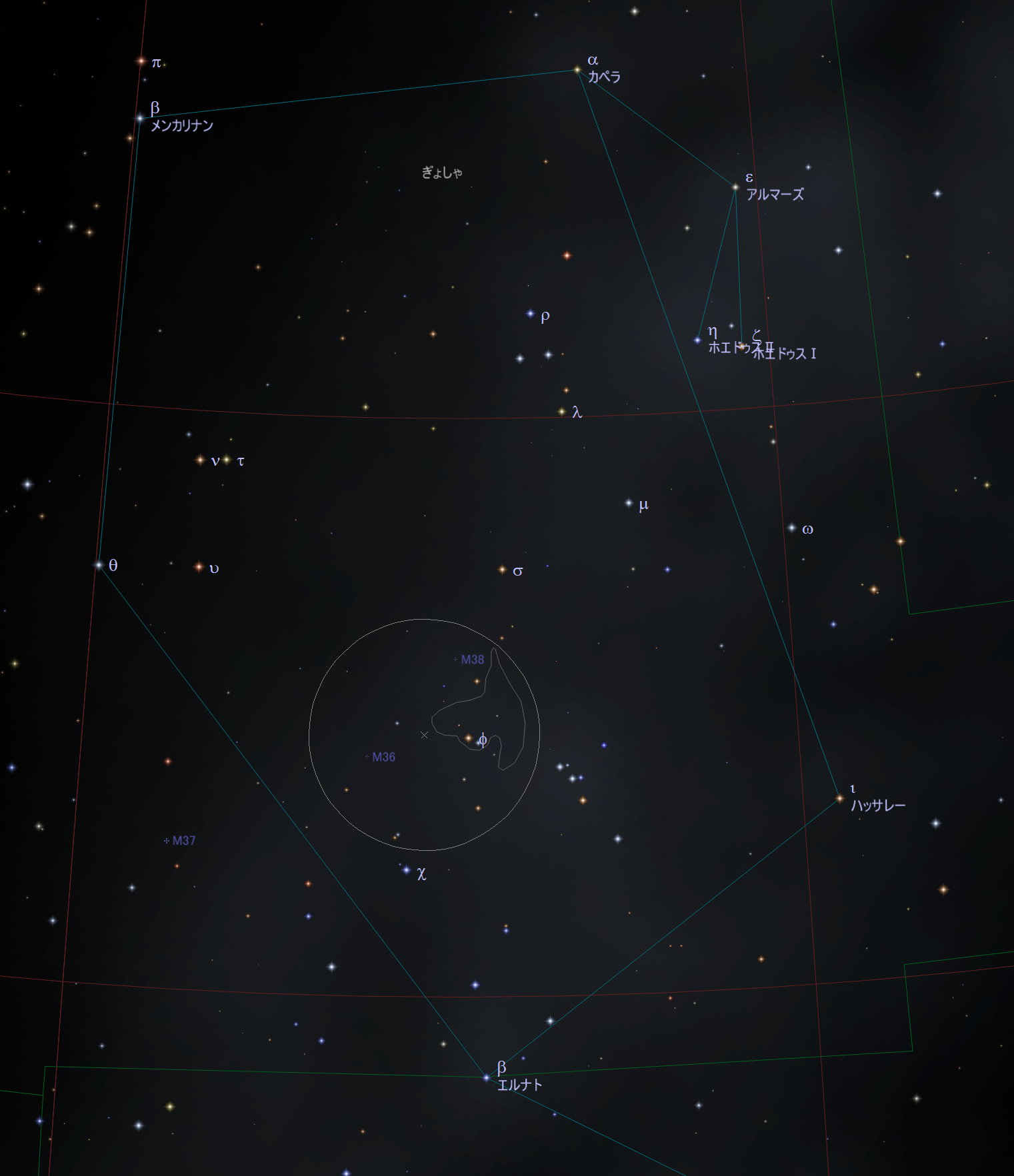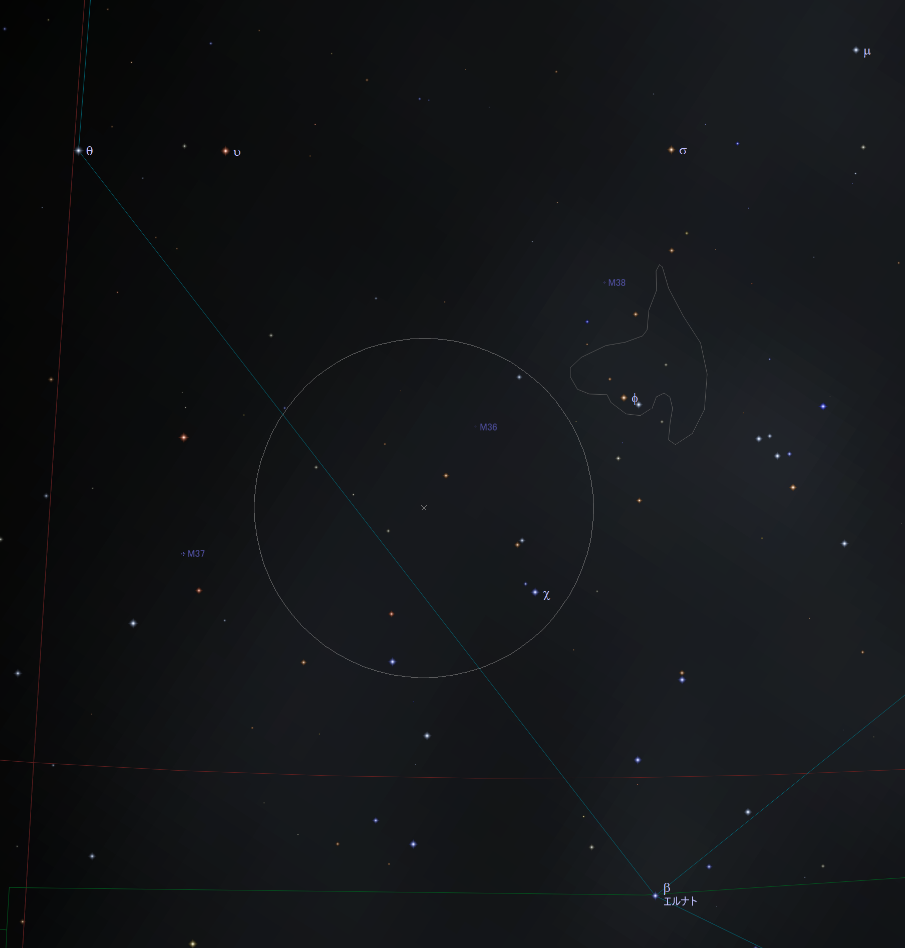 | 天体メモ | ぎょしゃ座のメシエ天体トリオM36、M37、M38のうちの一つ。M36は五角形の内側(辺に近い場所)に位置する。 |