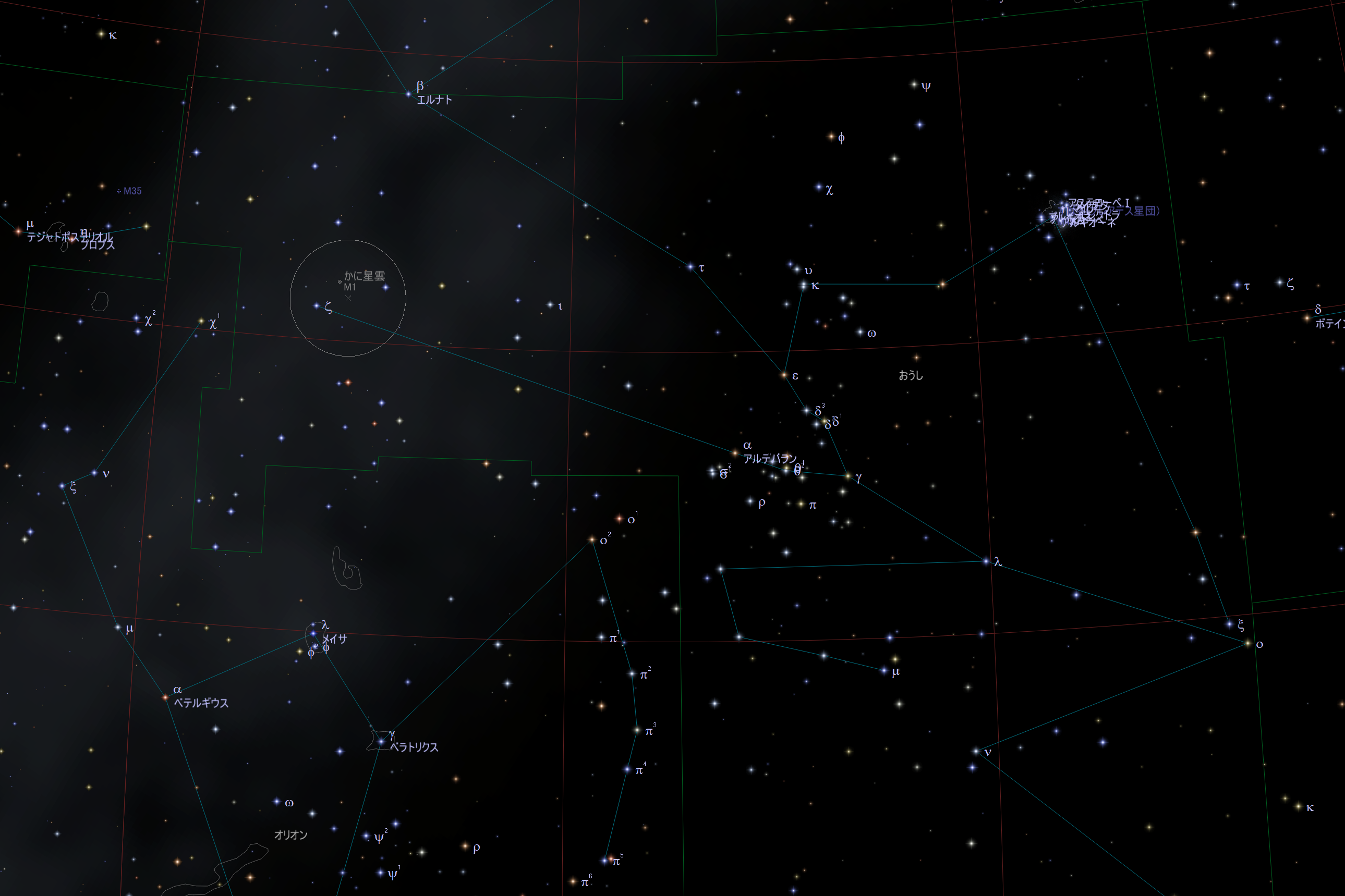 | 見つけ方 | おうし座の右の角先(オリオン座側:ζ星)から、北西に1度ほど。 |